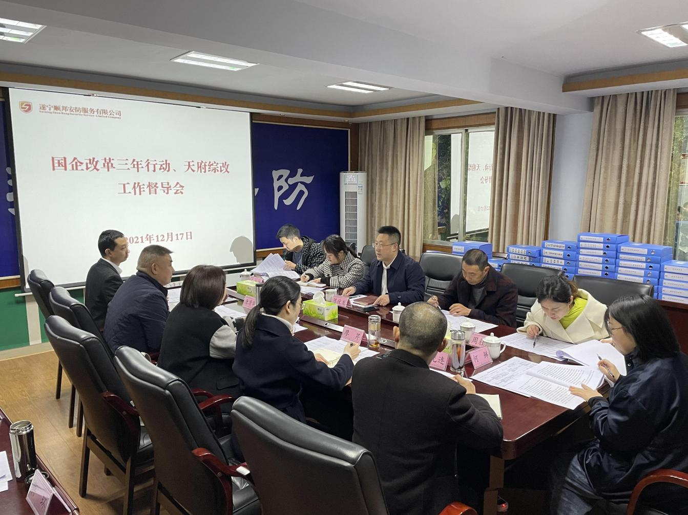 ? ? 12月17日,遂寧市國資委黨委委員、副主任陳伏龍一行到順邦安防公司督導(dǎo)國企改革三年行動、天府綜改相關(guān)工作。遂寧興業(yè)集團(tuán)黨委委員、財(cái)務(wù)總監(jiān)何玫,順邦安防公司黨委書記、董事長、總經(jīng)理唐清華,黨委副書記、監(jiān)事會主席廖芹,副總經(jīng)理董奎、劉光連和公司全體中層干部參加督導(dǎo)會。